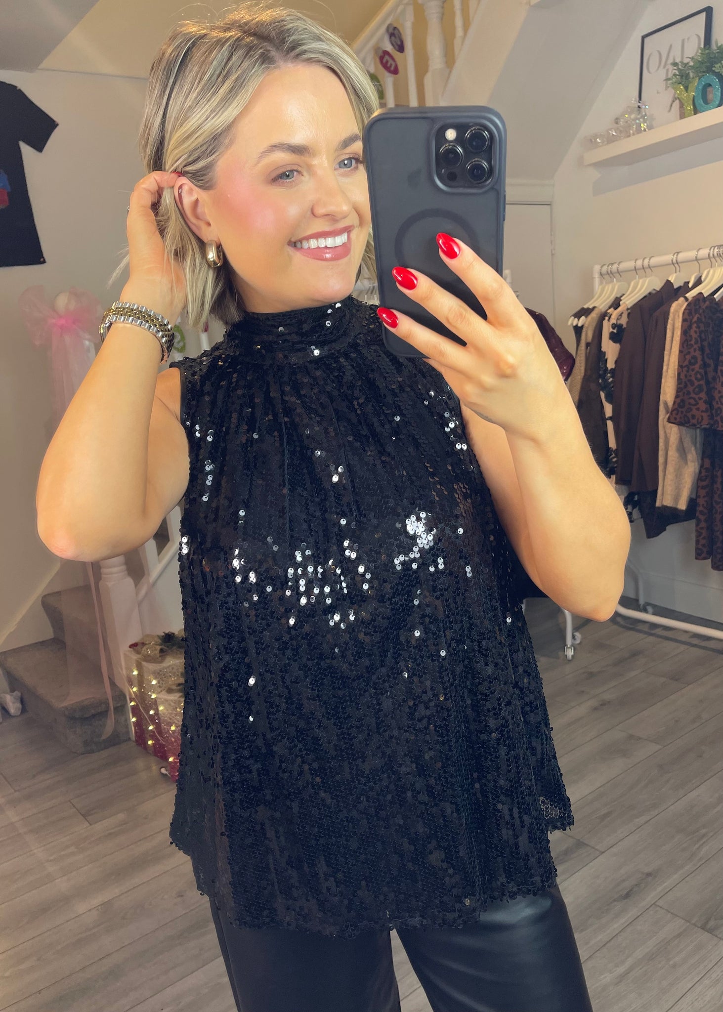 Embrace the sparkle of the season with Celeste, a show-stopping high-neck top that brings glamour to every occasion. Crafted from jet-black fabric and richly adorned with sequins, this top captures the light from every angle, creating a luminous, eye-catching effect.